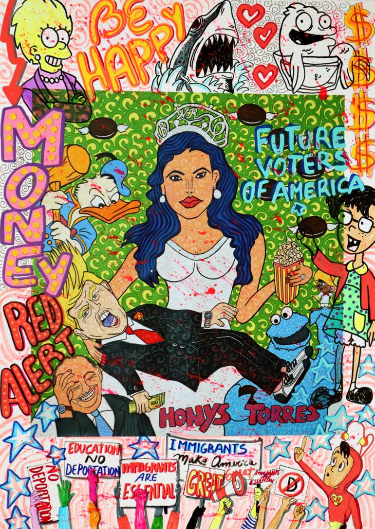 Red Alert is a pop explosion that confronts the immigration policies of Donald Trump, former owner of Miss Universe and now president of the United States. Amid icons, money, and cartoon figures, the piece denounces—with humor and anger—the paradox of a country that celebrates spectacle while deport...