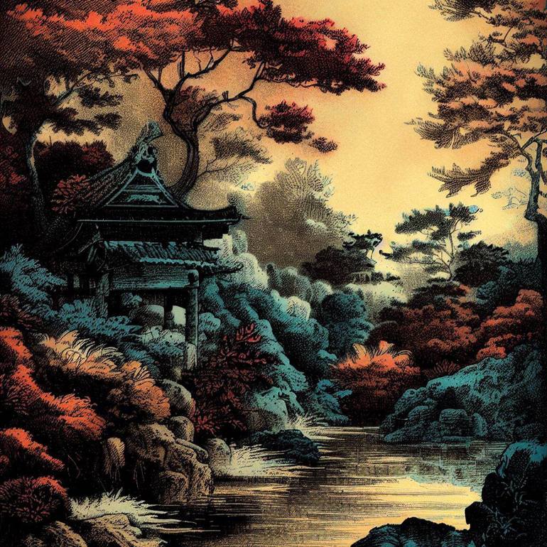 A thematic AI generated image in gravure style and colorization, yet in the splendorous japanese gardens theme, places that invites and inspires people into contemplation and meditation, to seek and achieve peace and wisdom. Part 6 of a new series of 10 under this theme.