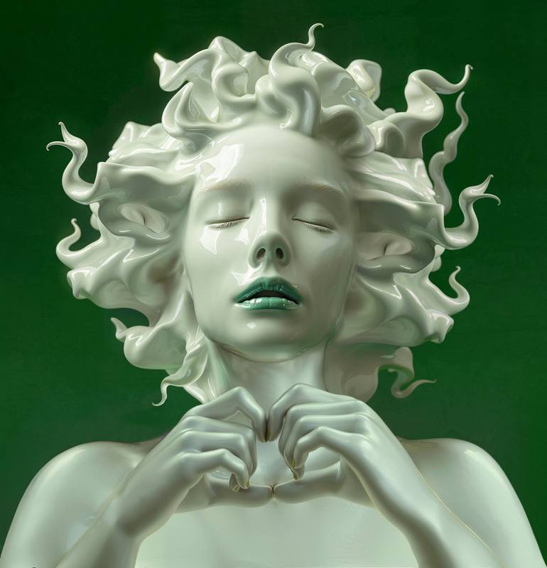 SERAH-MIKA This Ceramic Woman, is a minimalist yet evocative portrayal of the female form. Crafted from white ceramic, the figure's smooth surface and clean lines create a sense of purity and serenity. The woman's hair, rendered in a fluid, swirling pattern, resembles a cloud or a wave, adding a dyn...