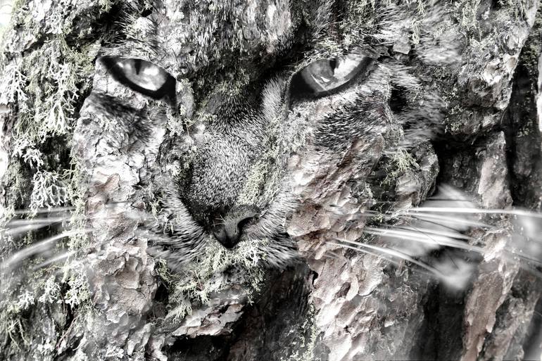 Some sobjects are relocated, with a magical meaning in the universe, therefore entirely fantastic. The cat, in it's ancient appearance, with his watchful and astute eye, even more as a wildcat and the elements of a mountain nature made of barks, plants and rocks, so rise to supernatural and mysterio...