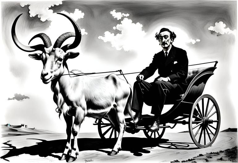 Scene of man who looks like Salvador Dali on a goat carriage, 1953. Painted in pencil.