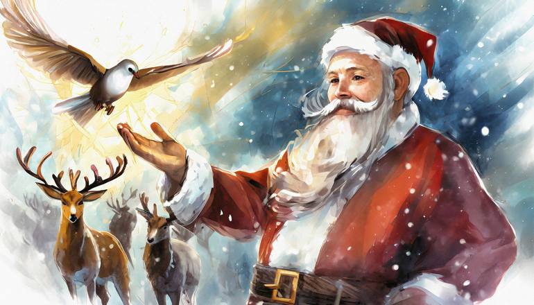 Santa Claus releases the dove of peace among the reindeer to bring peace to the world!