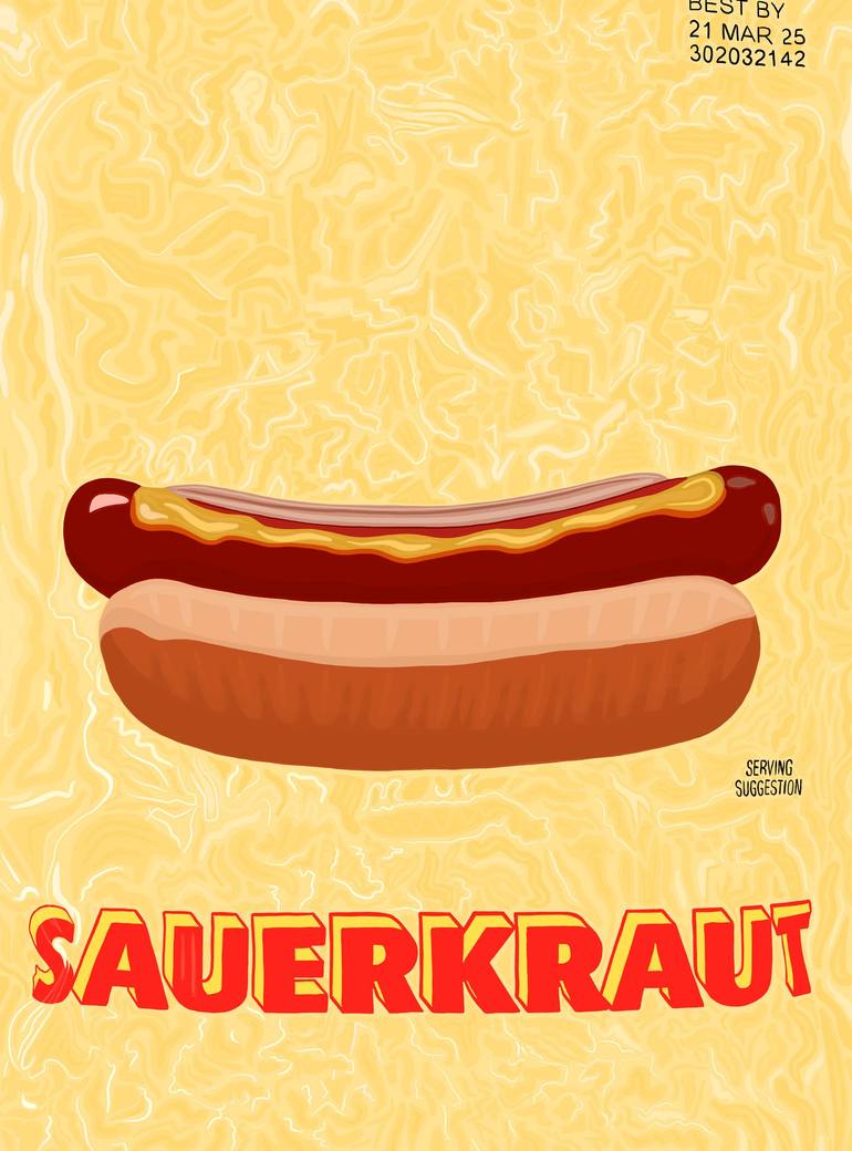 This image is drawn freehand on an iPad with an Apple Pencil and is beautifully printed with archival, Epson ink on fine art paper. I will only make one print of this image. It depicts a the label and contents of a clear sack of Sauerkraut purchased for a Fourth of July barbecue.