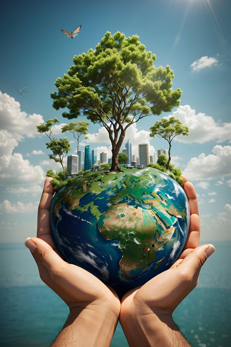 Depicting the Earth as a lush tree cradled by hands symbolizes human responsibility towards the environment. By incorporating a sprawling city encroaching upon the natural landscape, the image underscores the delicate balance between urbanization and nature preservation, conveying the duality of coe...