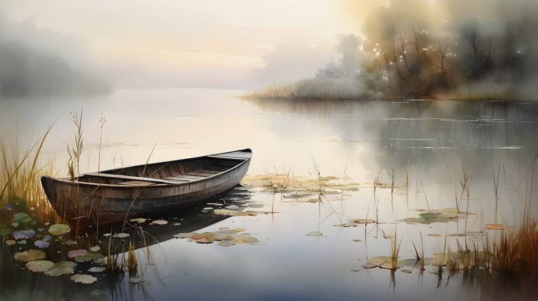 I painted this piece after countless dawns spent by my favorite lakeside, where mist clings to the water like a whispered secret and the world feels reborn. Mimicking delicate watercolor washes, I layered soft blues, blush pinks, and muted greens to capture the hushed glow of sunrise. The rowboat,...