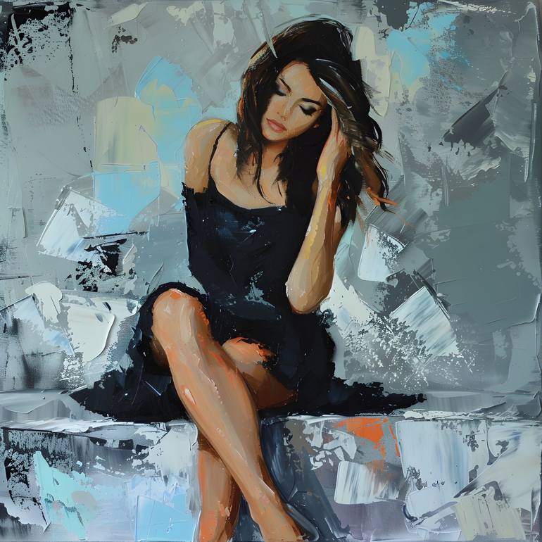 In this digital artwork, a serene atmosphere envelopes a girl seated on the bed. With her eyes closed, she exudes a sense of calm and introspection. One hand delicately touches her flowing hair, as if savouring a quite, personal moment. Soft, ambient light bathes the scene, highlighting the delicate...