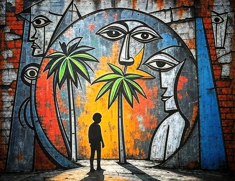 A mural displays abstract faces alongside green palm-like trees. A child's silhouette is seen in front, creating a dramatic effect.