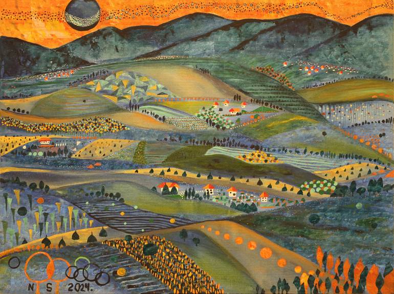 Šumadija, this is the lower panel of "Šumadija-Ćilim" composition, representing a rolling hills of this region in Serbia with scattered villages, orchards and green fields. This painting transports viewers to a serene, dreamlike landscape where rolling hills and quaint villages nestle under a vibra...