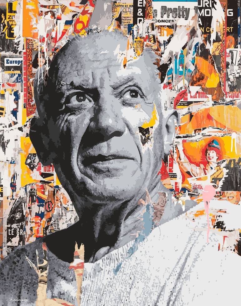 I paint mainly subjects of famous people, celebrities, and icons of pop culture and fashion; faces, figures, comics. My artworks are a combination of Pop Art and Street Art painted on a collage of torn letters from posters and advertisements extracted from the streets, which are digitized and assembled into the final piece. It is definitely modern, radical painting with a visually beautiful language for the viewer. Intense and vibrant colors combine with large splashes of contrasting colors adorned with multicolored French tears. My major influences are Andy Warhol, Roy Lichtenstein, Jackson Pollock, Jacques Villeglé, and Mimmo Rotella. I enjoy working on fairly large formats, ranging from 1.20 to 1.70 meters or larger. I often use different digital techniques, especially when assembling the collages of sources and letters for the abstract backgrounds with torn pieces of paper. I feel a certain fascination for these street paper letters from our poster culture; they function as small testimonies of what surrounds us, and each person randomly interprets them to evoke personal feelings or memories. Taking these letters and fragmenting them in a completely different context than what they originally present on the walls allows me to offer new expectations of interpretation among viewers. The portraits are digitally created in a monochrome palette of 10 to 30 colors, giving a more elegant and avant-garde look to the artwork. Street art, as well as abstract art, play a crucial role in my work. I am fascinated by working with the aesthetics of letters and fonts from torn posters and billboards on the walls of the streets. They are beautiful in themselves; free, vibrant, spontaneous, colorful, exciting, and without rules. I like to create them digitally so that I have the freedom to express myself and channel all my energy inspired by urban beauty. In my paintings, I try to use various techniques to make my digital canvas resemble a painting worn out by the harsh environment it is in. These street resources or supports are always weathered, scratched, and damaged by exposure to rain and the environment. I strive to make it as close as possible to a real urban landscape where everything complements each other in a single homogeneous composition between the painted surface and the collage of street letters. I always start creating the various layers in a spontaneous way, often using a variety of techniques such as collage, painting, and spray drips.
