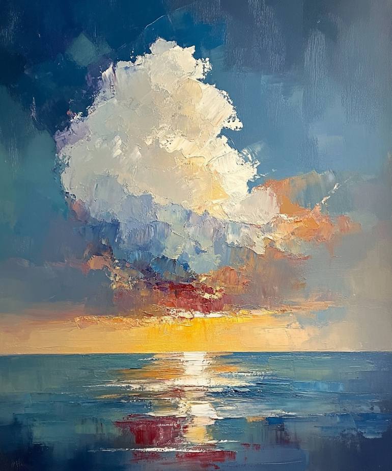 Hello my viewer! This stunning seascape captures the tranquil beauty of a sunset on the horizon. Golden and peach hues blend seamlessly with soft blues, creating a mesmerizing reflection on calm waters. Billowing clouds embrace the warm glow of the setting sun, evoking a sense of peace and serenity....