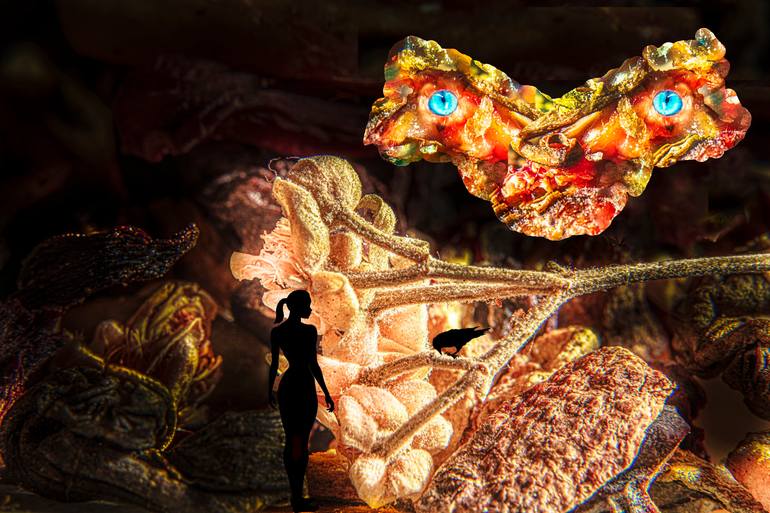 A silhouetted figure stands amidst vibrant, textured objects that resemble sea life, with a focal point of what appears to be colorful, glowing eyes on an abstract, butterfly-like form. The scene is lit with a spotlight effect, highlighting the iridescent hues and intricate details of the surroundin...
