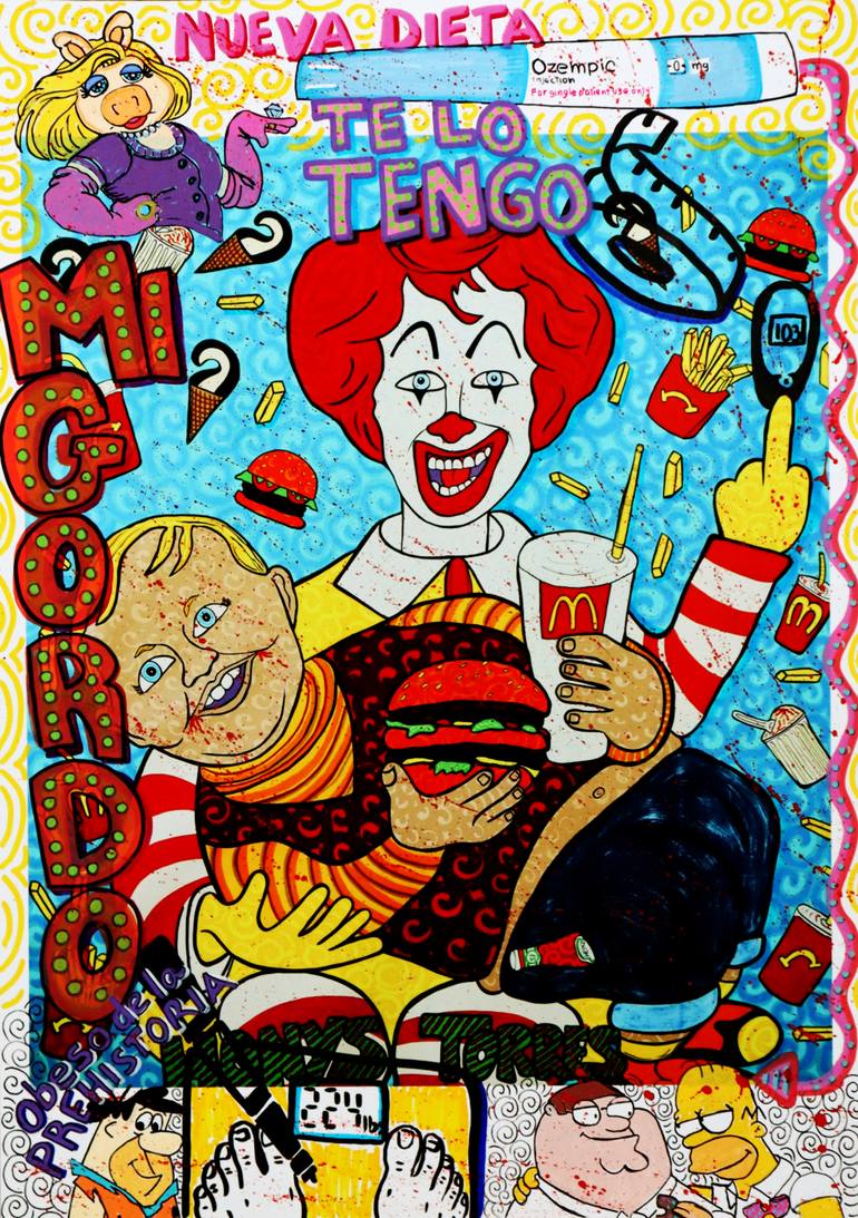 Te lo tengo exposes the toxic alliance between the fast food industry and Big Pharma. Ronald McDonald, cast as a paternal figure, feeds a smiling child with burgers and fries while the background explodes with calories, sugar, and promises of happiness. Above them, a syringe labeled Ozempic injectio...