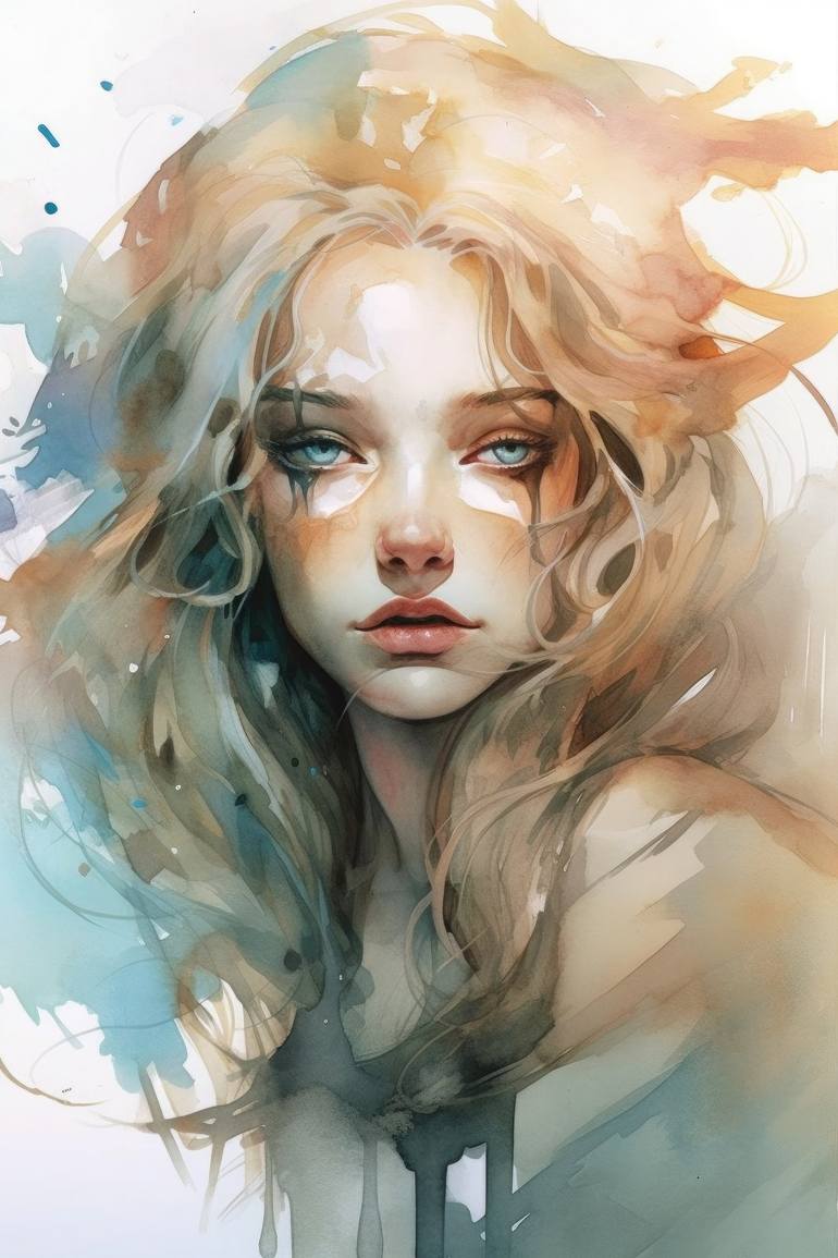 This digital artwork portrays a young girl with an alluring face, characterized by bright, expressive eyes and luscious, flowing hair that cascades around her features. The vivid emotions expressed on her face convey a sense of passion and fierce determination, indicative of her strong will and fier...