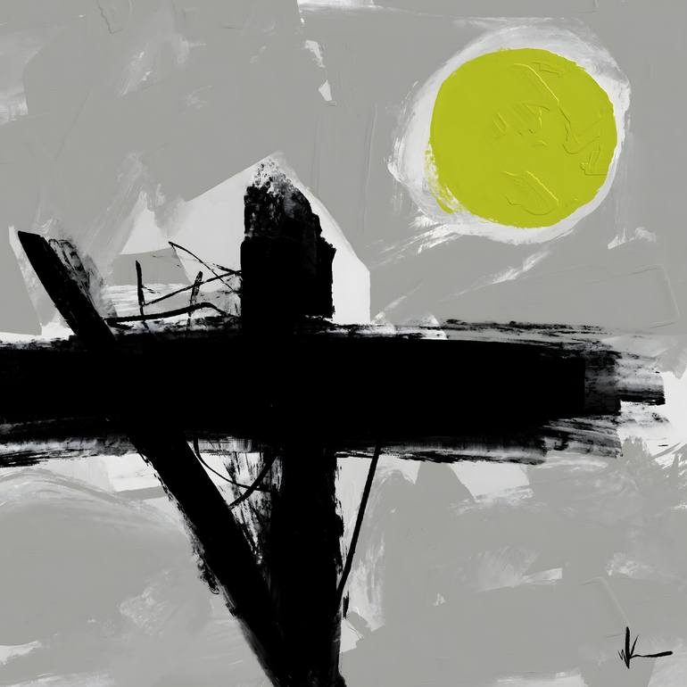 A bold black cross intersects with a textured gray background, while a bright yellow circle adds contrast. The abstract composition evokes a sense of minimalism and modern art.