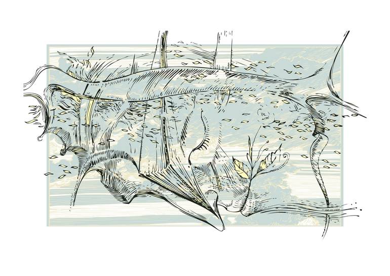 Pen drawing, vector graphic: Print on paper, height 29,7 cm by width 42 cm. The FACE is an abstract composition depicting an unidentified - dreaming FACE forming abstract details, symbolically depicting souls in the daylight uncontrolled space of the sky. The graphics are drawn with vector graphics ...