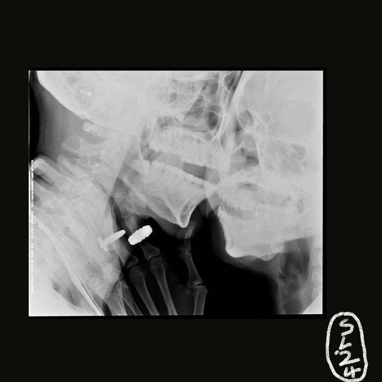 A moment of intimate connection through the stark, revealing lens of an X-ray. This piece focuses on the juxtaposition of human interaction with the clinical coldness of medical imaging. The artwork features two skulls in close proximity, suggesting a kiss or a whisper, with one skull adorned with a...