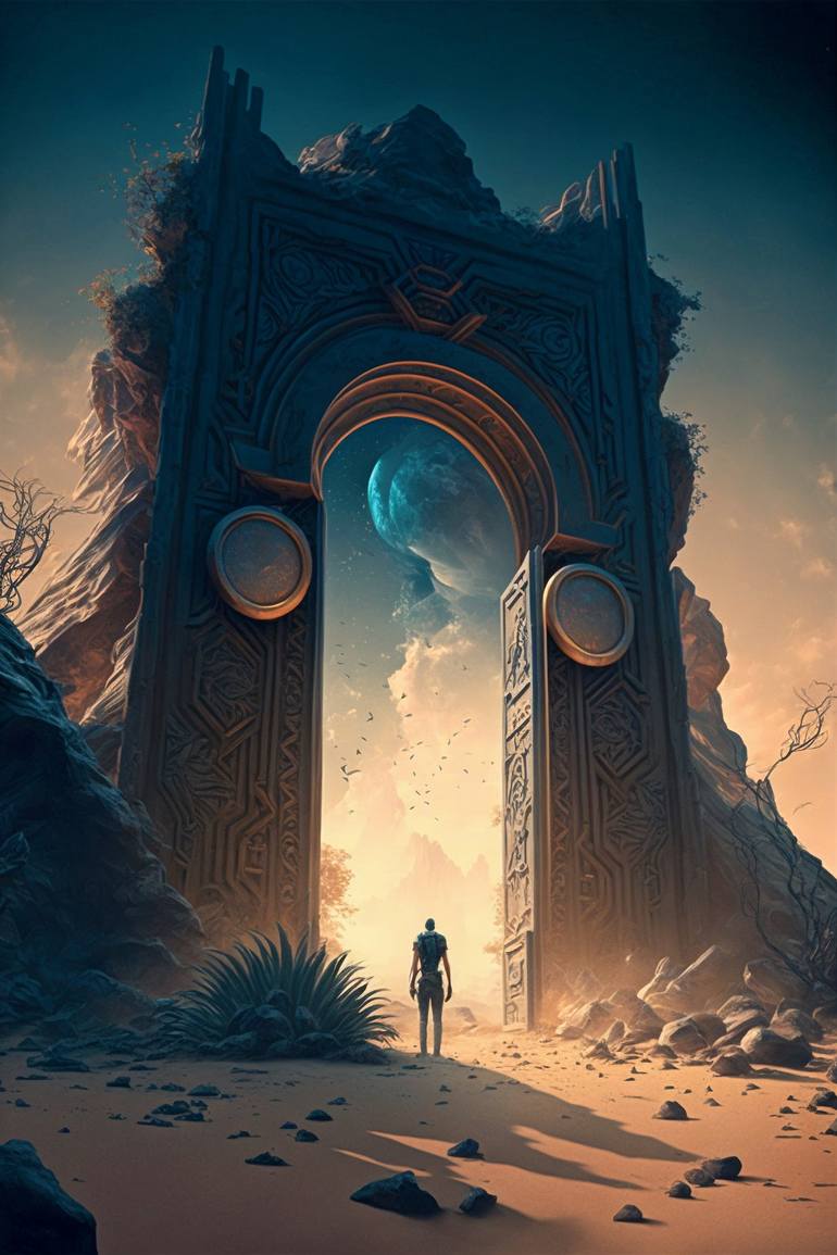 Step into a world of wonder and possibility with this breathtaking artwork. The "Mystical Gateway" captures the imagination as a portal to an alternative realm beckons, inviting the viewer to explore the unknown. The man in the foreground, lost in thought, ponders the decision to leave the familiar ...