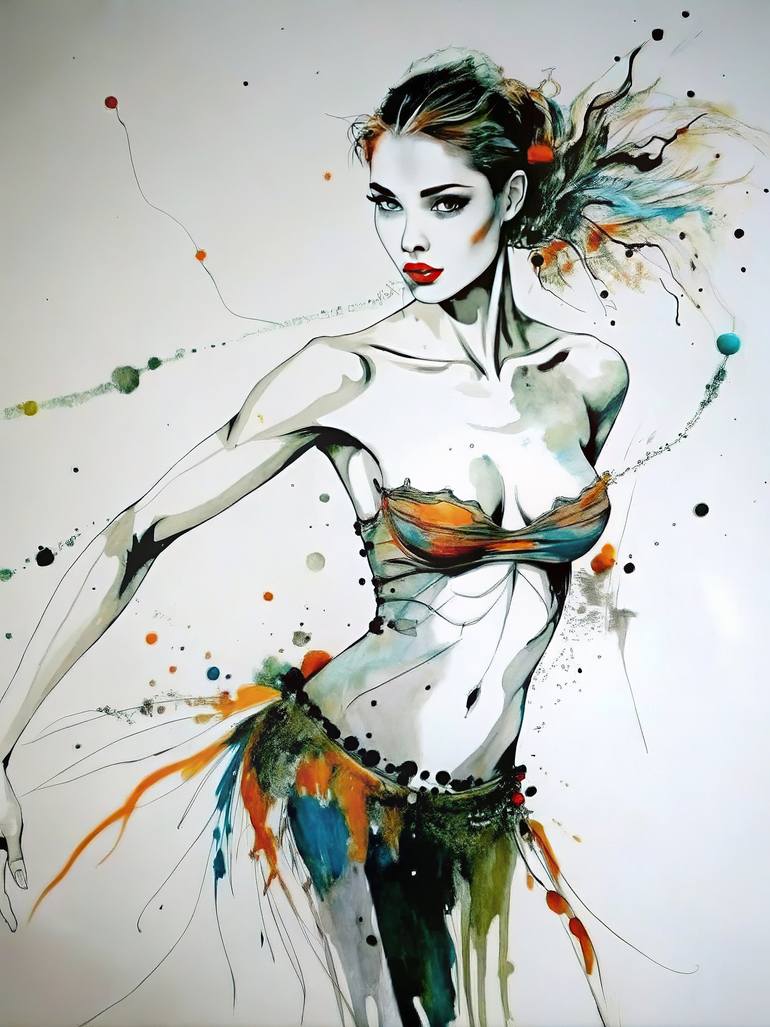 This stunning artwork blends the elegance of movement with an ethereal sense of energy. The figure, flowing yet powerful, seems to dance across the canvas, her form accentuated by splashes of vibrant orange, teal, and black hues. The artist masterfully integrates delicate lines, dynamic brush stroke...