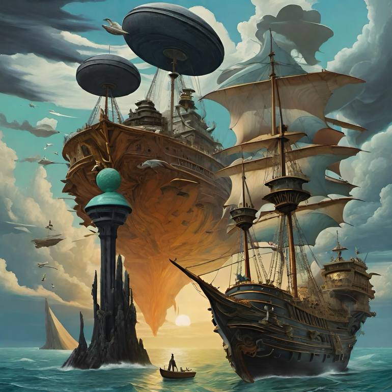 The Voyage of the Soul's Ascent In skies where ancient whispers blend, A ship of dreams does upward send, Its sails of hope, a golden hue, Through mystic clouds, it pierces through. A vessel vast, of timbered grace, Floats high above the ocean's face, With domes of thought, like moons th...