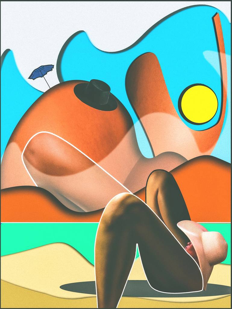 The innocent summer games transforms an ordinary summer scene into a field of ambiguities, where body, landscape, and object merge into a single visual flow. The reclining figure, fragmented between figuration and abstraction, becomes a sculptural relief blending with mountains, sky, and sun. The ti...