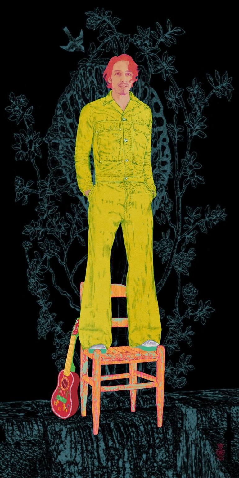 The image portrays a man standing on a wooden chair against a dark background. He's wearing a bright yellow denim jacket and matching pants, with his hands casually in his pockets. His hair is reddish-brown and styled in a casual way. Behind him, there's a large, intricate floral pattern in a bluish...