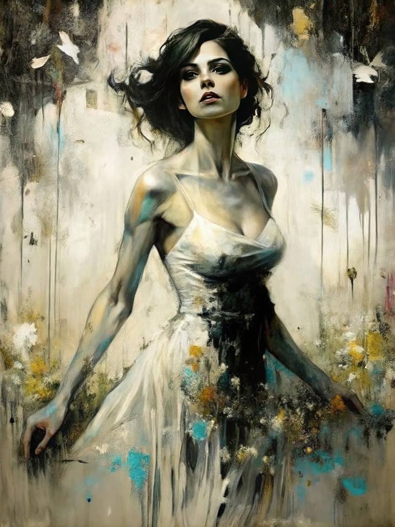 This evocative artwork captures the timeless beauty and strength of the feminine spirit. The figure stands poised yet dynamic, her flowing white dress merging seamlessly with textured strokes of soft blues, yellows, and grays, creating an ethereal harmony. Her piercing gaze and windswept hair embody...