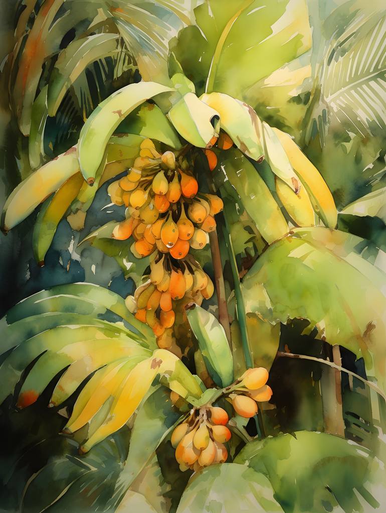 I was inspired by the lush energy of tropical markets, where sunlit bananas cascade beside vibrant palm fronds, their colors a symphony of warmth and life. In this watercolor, I layered translucent washes and crisp details to capture the velvety texture of ripe bananas and the feathery edges of ve...