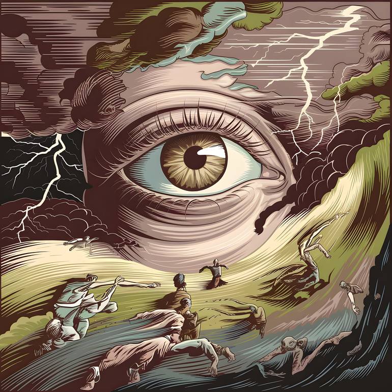 This artwork is inspired by themes of fate and cosmic power, depicting a watchful eye overseeing humanity's struggle within chaos, blending mythology with surrealism. The artwork is 102 cm by 102 cm and is printed on textured canvas material or grey back canvas to bring out the reality of the color...
