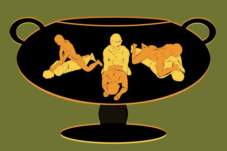 Inspired by the bawdy paintings found on Greek vessels, I have used my "cut out" style to recreate these fun and naughty designs