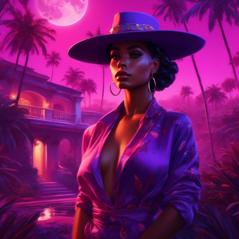 This digital piece titled Twilight Essence was designed by me, Kellyann Nolan, also known as Designs by Kellyann. It features a beautiful ebony woman dressed in a richly textured purple outfit, exuding confidence and elegance. Her stylish wide-brimmed hat complements the intricate patterns in her en...