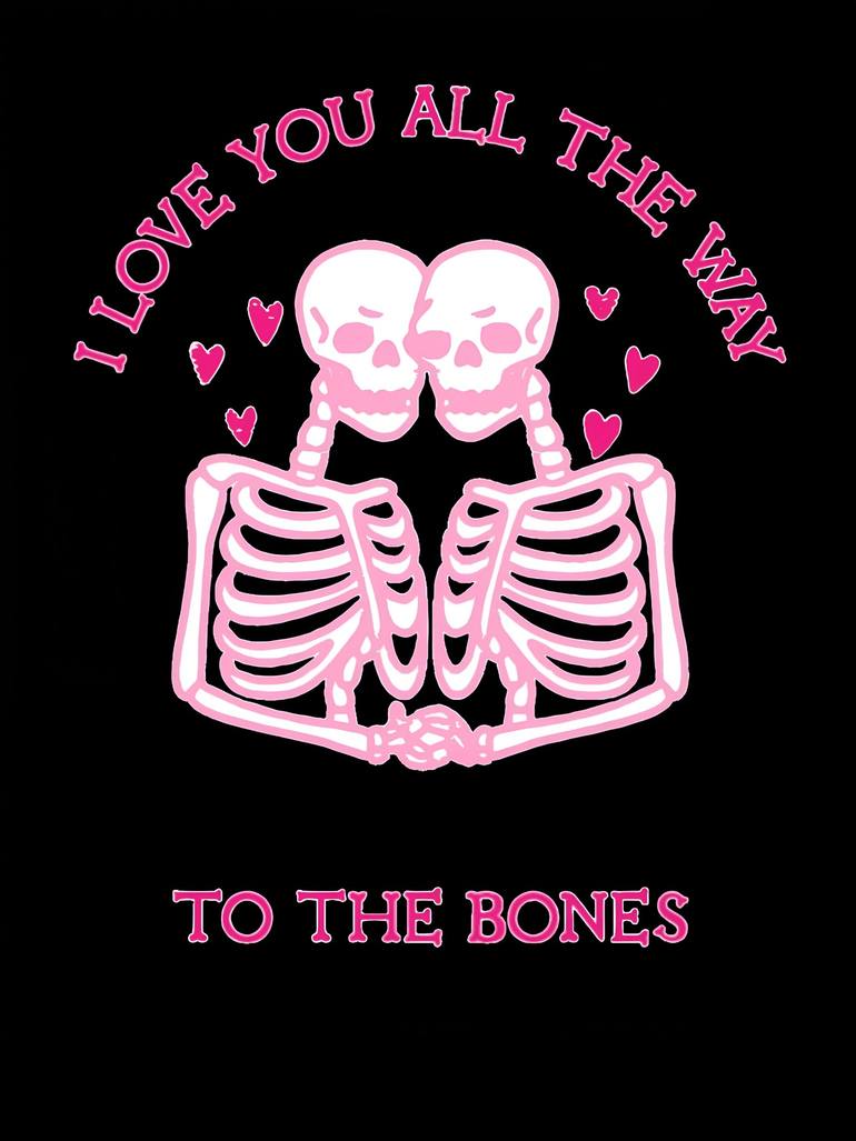The full name of this painting is: Graphic image of two pink skeletons in love on a black background with fuchsia hearts and inscription: "I LOVE YOU ALL THE WAY TO THE BONES". Unfortunately, Saatchiart limits the title to 65 characters. This is a story about love, passion and loyalty to a partner ...