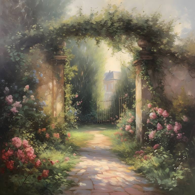 I envisioned myself strolling through a forgotten corner of the French countryside, where cobblestones worn by time lead beneath a canopy of roses and ancient trees. The archway, draped in climbing blooms, frames a distant chateau—a whisper of grandeur nestled in soft, misty light. I used a muted ...