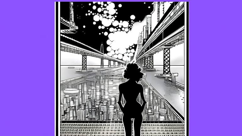 "Waiting" is a captivating piece of art that presents a stunning cityscape in black and white, with a touch of purple frames on the sides. In the center of the image, a lone girl's silhouette stands out, surrounded by the bustling urban environment. The picture evokes a sense of anticipation, as the...
