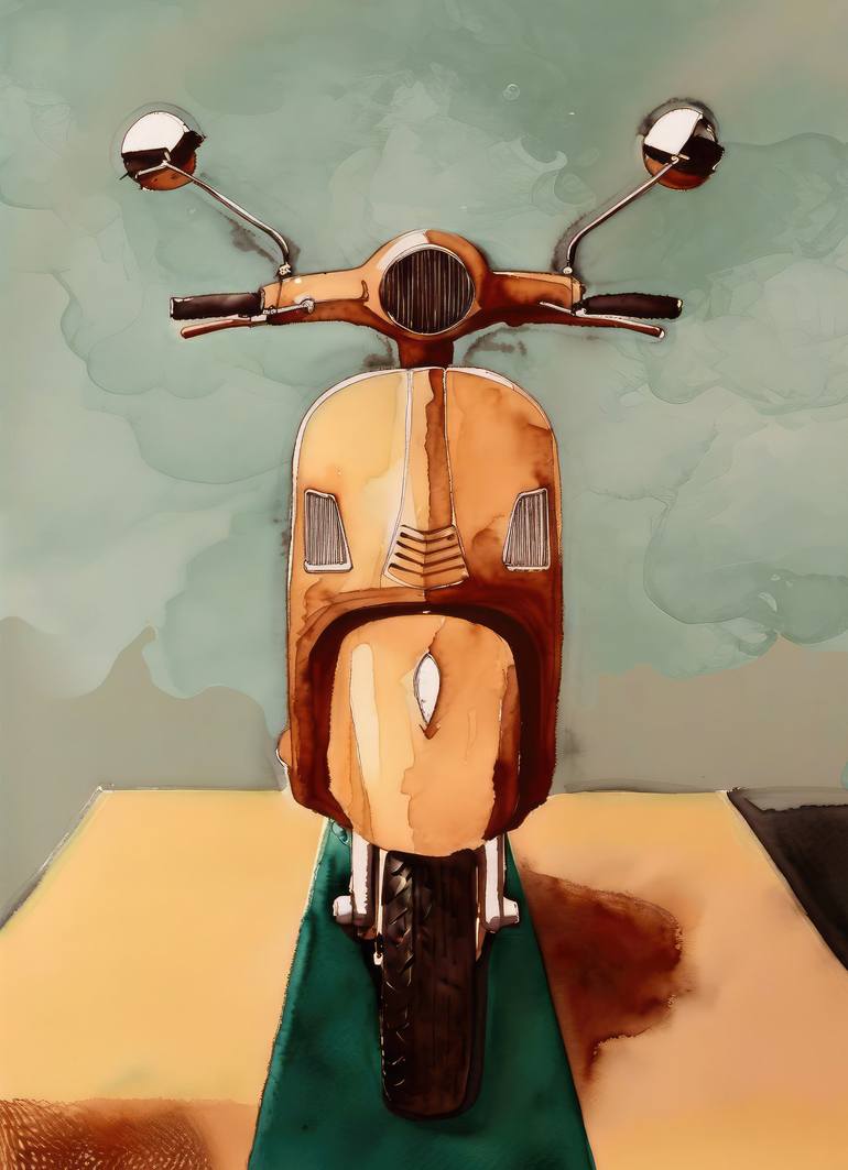Watercolor hand painted scooter illustration isolated on a green background. Vintage motorbike