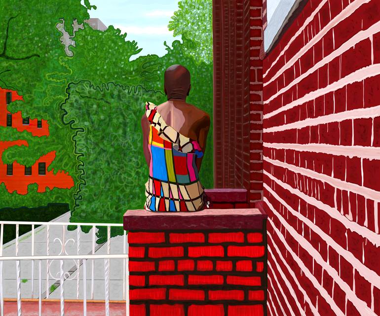 This image is drawn freehand on an iPad with an Apple Pencil and is beautifully printed with archival, Epson ink on fine art paper. Only one print will be made. A larger print size is possible upon request. A woman in a modern dress sits on her stoop in the summer time in Crown Heights, Brooklyn, ...
