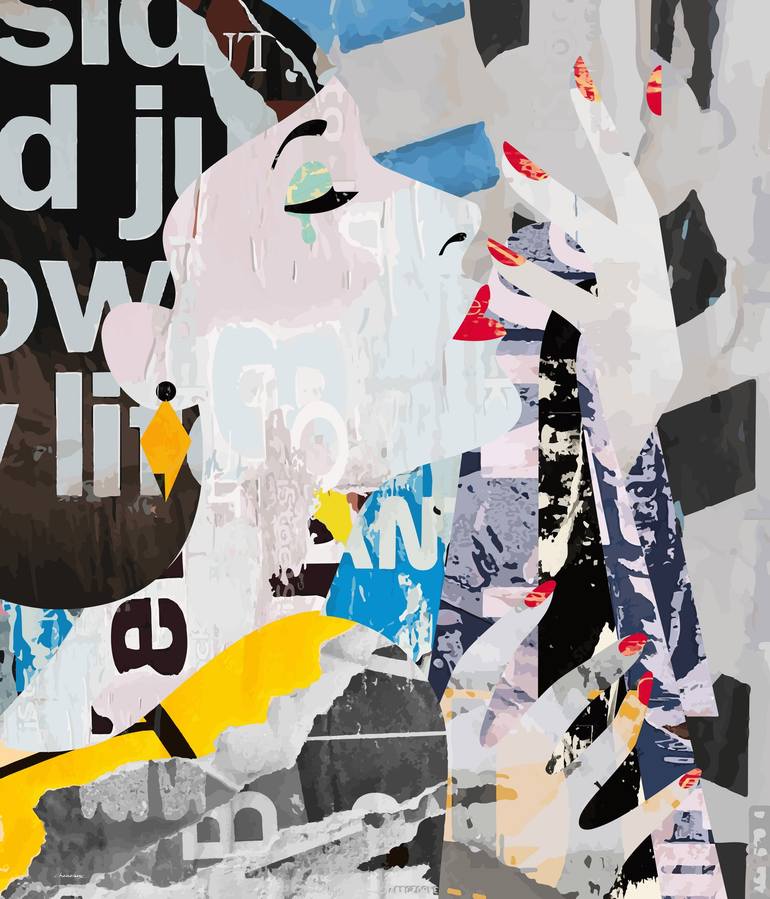 I paint mainly subjects of famous people, celebrities, and icons of pop culture and fashion; faces, figures, comics. My artworks are a combination of Pop Art and Street Art painted on a collage of torn letters from posters and advertisements extracted from the streets, which are digitized and assembled into the final piece. It is definitely modern, radical painting with a visually beautiful language for the viewer. Intense and vibrant colors combine with large splashes of contrasting colors adorned with multicolored French tears. My major influences are Andy Warhol, Roy Lichtenstein, Jackson Pollock, Jacques Villeglé, and Mimmo Rotella. I enjoy working on fairly large formats, ranging from 1.20 to 1.70 meters or larger. I often use different digital techniques, especially when assembling the collages of sources and letters for the abstract backgrounds with torn pieces of paper. I feel a certain fascination for these street paper letters from our poster culture; they function as small testimonies of what surrounds us, and each person randomly interprets them to evoke personal feelings or memories. Taking these letters and fragmenting them in a completely different context than what they originally present on the walls allows me to offer new expectations of interpretation among viewers. The portraits are digitally created in a monochrome palette of 10 to 30 colors, giving a more elegant and avant-garde look to the artwork. Street art, as well as abstract art, play a crucial role in my work. I am fascinated by working with the aesthetics of letters and fonts from torn posters and billboards on the walls of the streets. They are beautiful in themselves; free, vibrant, spontaneous, colorful, exciting, and without rules. I like to create them digitally so that I have the freedom to express myself and channel all my energy inspired by urban beauty. In my paintings, I try to use various techniques to make my digital canvas resemble a painting worn out by the harsh environment it is in. These street resources or supports are always weathered, scratched, and damaged by exposure to rain and the environment. I strive to make it as close as possible to a real urban landscape where everything complements each other in a single homogeneous composition between the painted surface and the collage of street letters. I always start creating the various layers in a spontaneous way, often using a variety of techniques such as collage, painting, and spray drips.