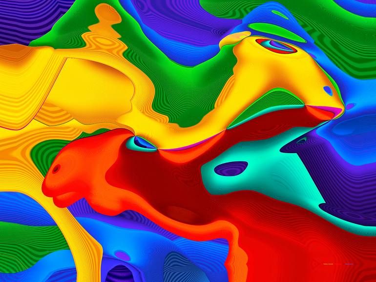 The picture is made in the style of Color Flow. Although a different color volume - yellow, red or blue, represents each animal - still, these color forms are in a proportional balance. Smooth lines evoke a state of peace and harmony. The colors are not monochrome; they contain darkened undulating p...