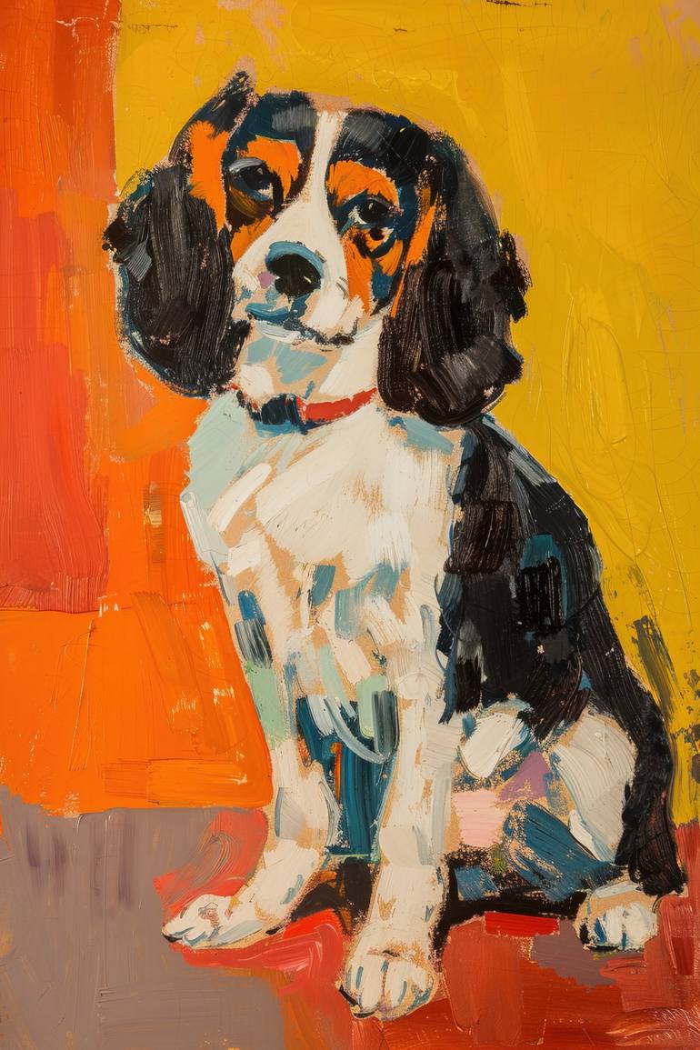 Hahnemühle Art Canvas Smooth archival quality, matte, natural white 370 g/m². Germany Cute illustration of Cocker Spaniel dog Cartoon Cocker Spaniel with abstract shapes Black and white fur dog art Cocker Spaniel with plants in pastel colors Minimalistic dog design Keyword-rich Description: Bring a...