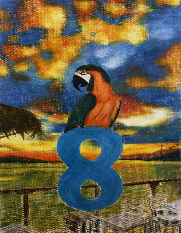 This work is the combination of two infinities. There is no beginning and no ending of number eight's structure, and parrot is the bird that characterized who's never stops twittering.