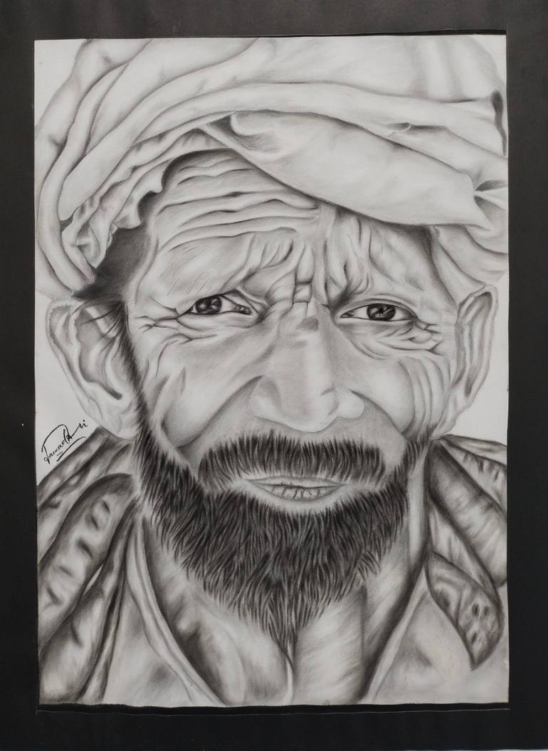 It is a portrait of an elderly man. Wrinkles and creases on the face represent the trials and tribulations of a life well lived. Eyes seem to hold thousand of stories. Its a powerful portrait that invites the viewer to reflect on the human experience.