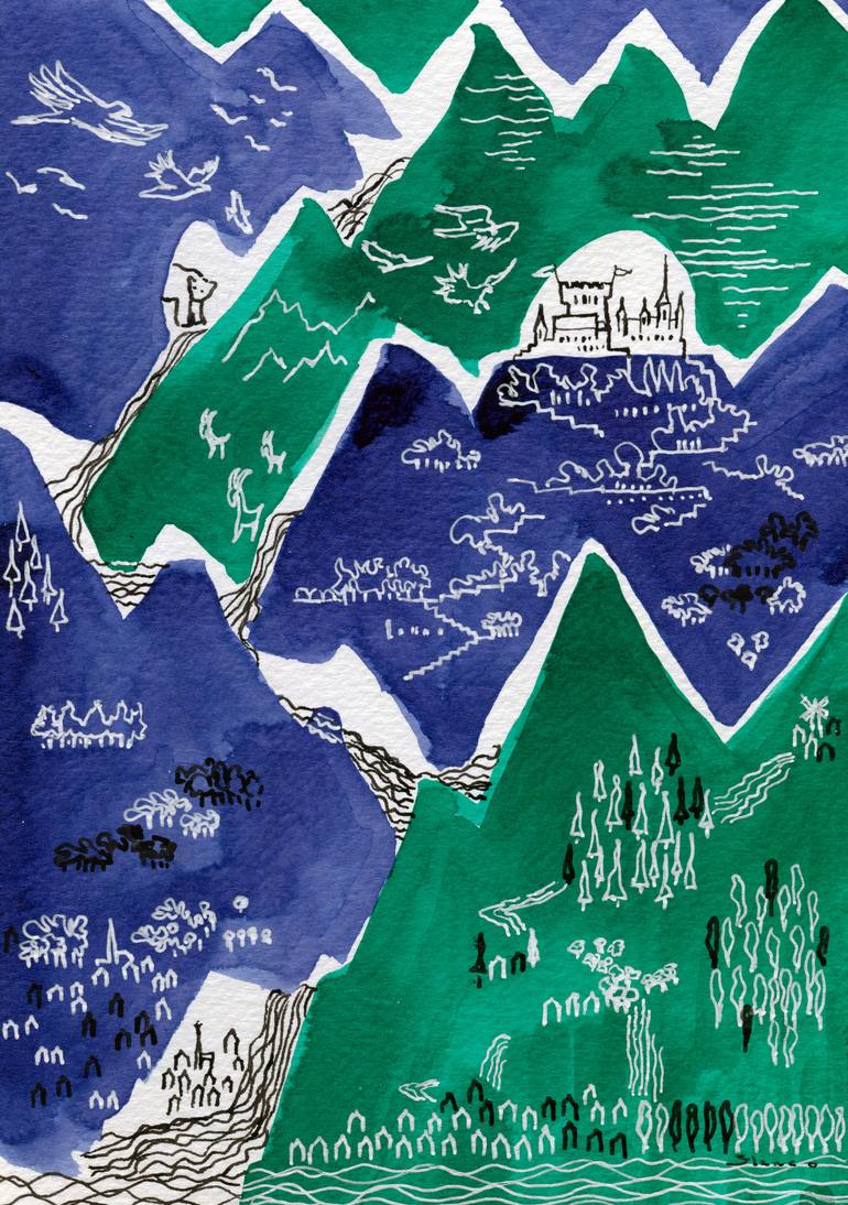 This is part of a series of illustrations of Oscar Wilde's short story The birthday of the infanta, one of the most beautiful of his very beautiful writings. I worked the series in this blue and green strong shades of ink and black and white pen line drawings. I was inspired by his fantastic descriptions of a half imagined half real Spain. For more about me and my work visit dreamyme.com