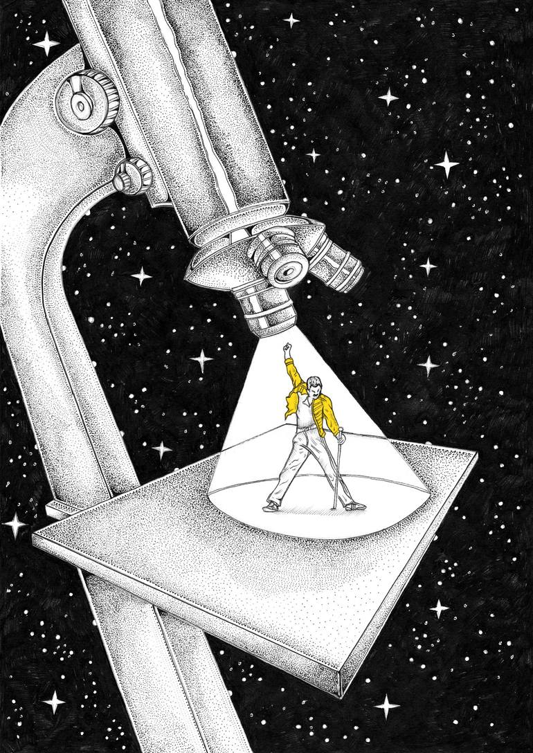 A unique Freddie Mercury tribute that isn't another portrait but metaphorically casts a spotlight on his life in a surrealist style, which gives meaning and purpose to the illustration. The illustration is part of 'The Art of Storytelling' collection.