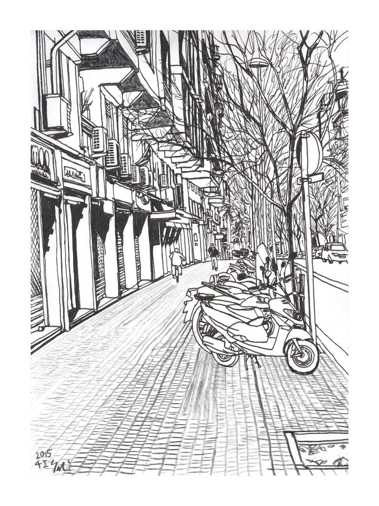 A common everyday scene in a residential area of Barcelona. Away from the tourist attractions, the air is quiet. Scooters are resting on the street until their masters appear. People are moving on with their new day, some in cars, some astride bicycles, and some on leisurely walks. Drawn live on th...