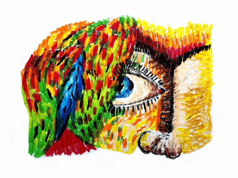 Abstract oil pastel drawing of a Savage woman with a blue feather. One of the works in the Vivid Oil Pastel Drawings series. Please check available sizes and materials for Saatchi Art open edition prints.