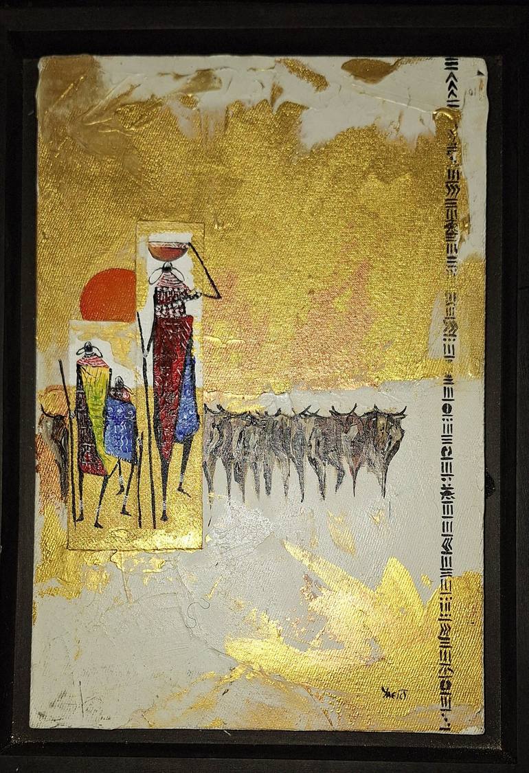 This artwork is a vertical painting with a striking combination of textured gold, white, and deep red. It appears to depict two stylized figures, possibly warriors or traditional tribesmen, wearing red garments with intricate patterns, holding long staffs or spears