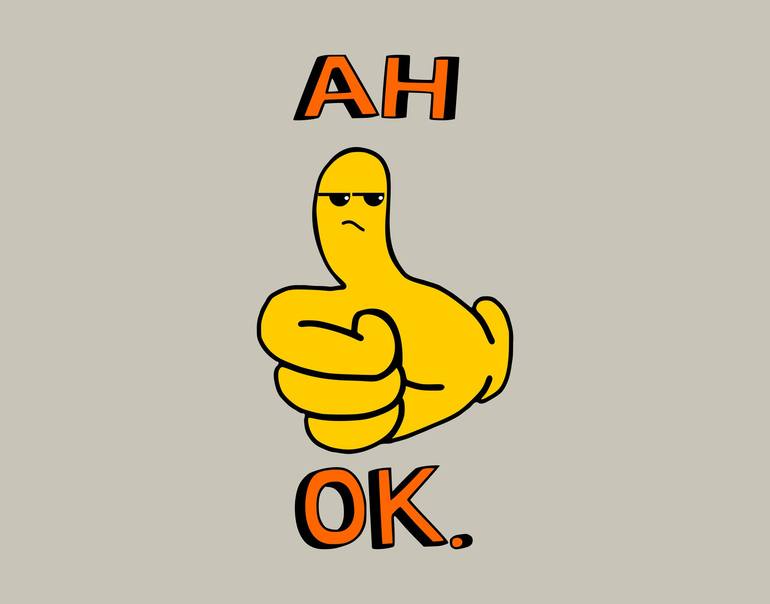 A cartoon thumbs-up with the text "Ah Ok," inspired by the way we use emoticons in instant messaging to convey feelings and emotions. In this design, the thumbs-up emoji isn't necessarily what it seems—it can either align with or differ from the viewer's usual associations, depending on their person...