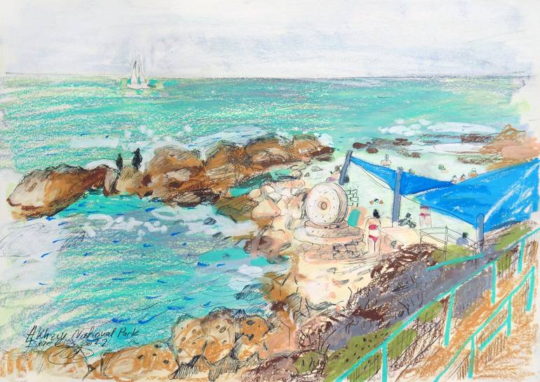 This drawing was made in camping near the Mediterranean Sea Akhziv. This is a page from my travel diary and sketchbook. Usually, I have on my road oil pastel and watercolor, because it is easy to travel with these materials, also oil pastel is vivid and bright. Great location, with a beautiful view ...