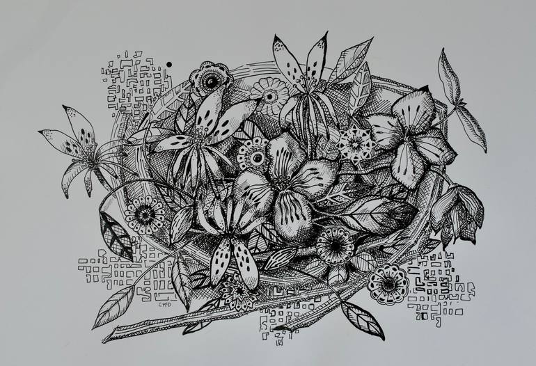 This is a black ink drawing on white paper featuring a highly detailed floral composition. The artwork showcases a dense arrangement of flowers, leaves, and abstract geometric elements. The flowers vary in shape and size, with intricate line work, stippling, and hatching techniques used to create te...