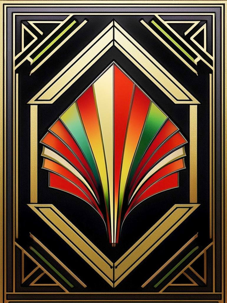A geometric design featuring a central fan-like motif in vibrant red, yellow, and green hues, set against a black and gold background. The symmetrical pattern is of the Art Deco style, with its sharp lines and rich color palette. If you would like a different size or substrate... no problem.