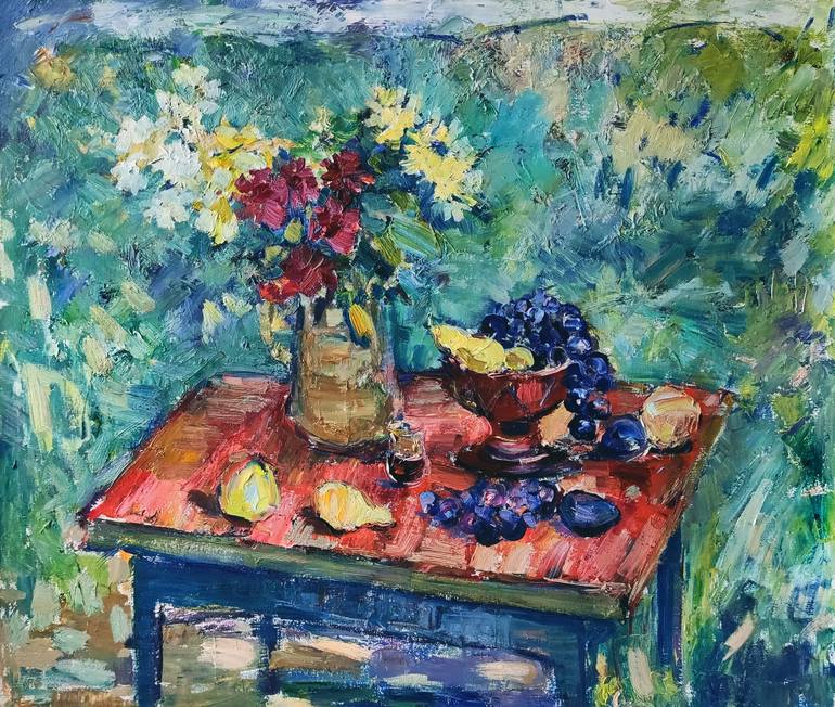 "August Naturemorte" is a painting inspired by the richness of late summer's bounty. Rendered in the impressionistic style, this still life captures a tabletop display of grapes, pears, and chrysanthemums arranged in a pitcher. The painting explores the interplay of light and shadow on the fruits a...